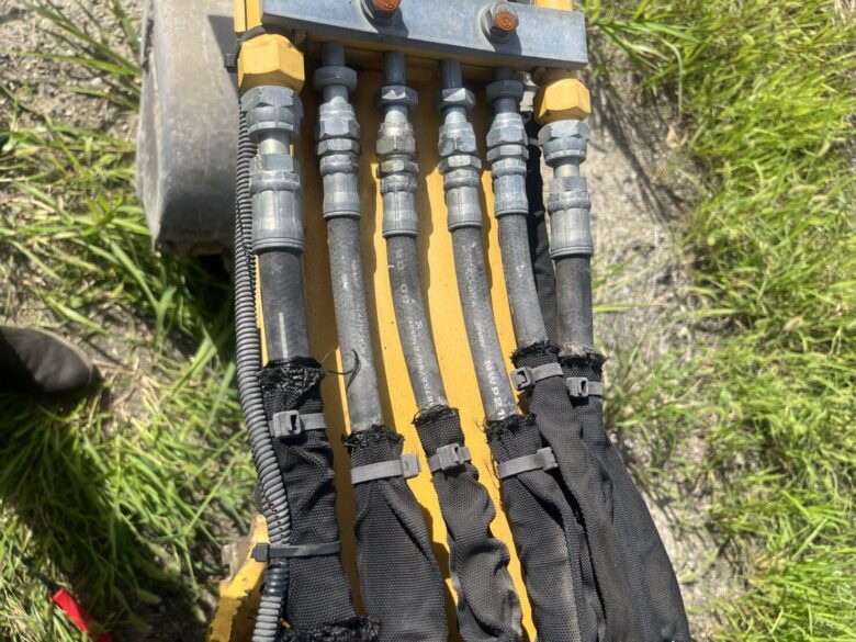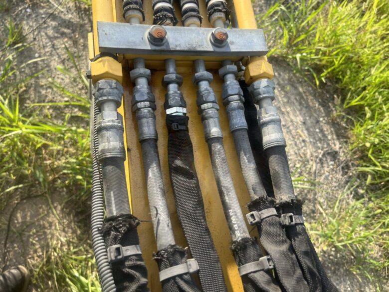 到着後機体を確認すると、ブーム根元にあるホースが擦れと経年劣化により破損し、油漏れが発生していることが判明。さらに、バケットシリンダーホースとブームシリンダーホースにつながる2本のホースからも油漏れが確認されました。お客様に状況をご説明し同時交換作業を実施する事となりました。