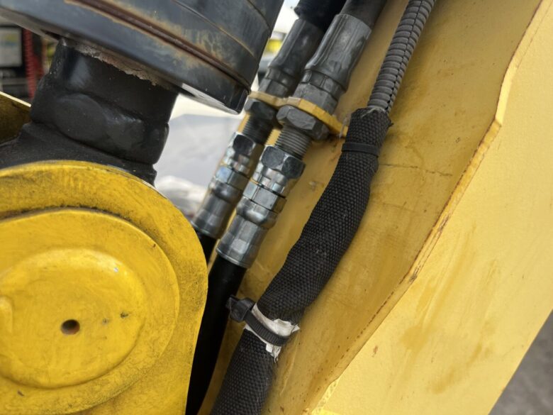 お客様より、バケットシリンダーに接続されているホースに劣化が見られるため交換してほしい。とのご依頼をいただき、出張対応で現地へ向かいました。バケットまわりのホースは作業時の負荷が大きく、動作頻度も高い為、劣化を放置すると油漏れや作動不良につながる恐れがあります。