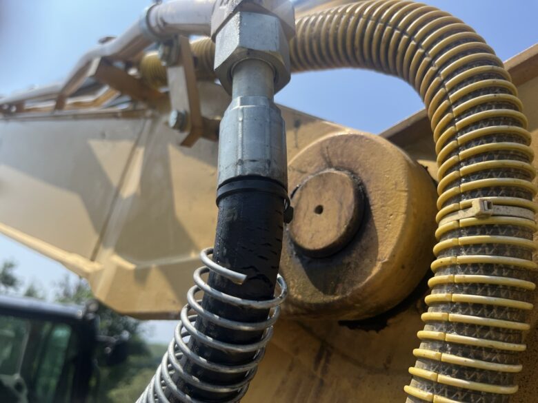 到着後点検すると、アタッチメントホースが経年劣化によるひび割れで油漏れを起こしている状態でした。このままでは作業効率が落ちるだけでなく、大きなトラブルにつながる可能性もあります。