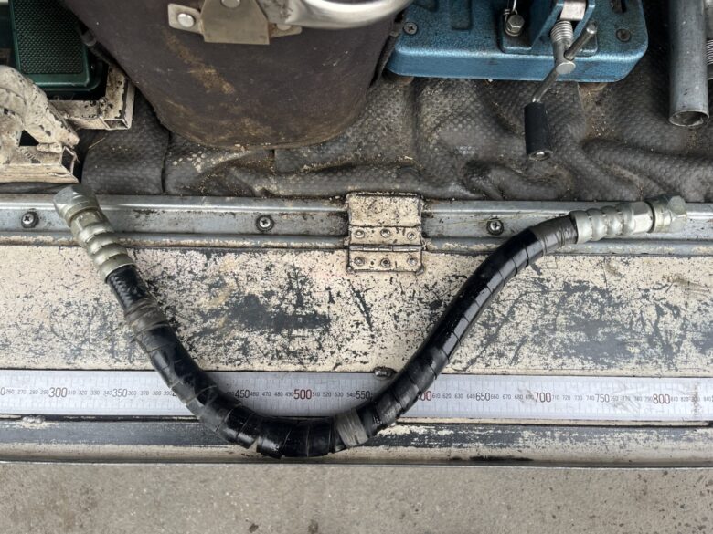 「油が漏れているので確認してほしい」とのご連絡を受けて現地に急行し、お客様立会いのもと状況を確認。問題のホースは経年劣化によってひび割れが発生しており、そこから作動油がにじみ出ている状態でした。
