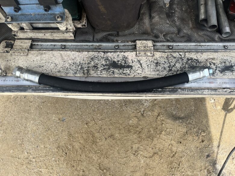 取り外したホースと同等仕様のものを現場で迅速に製作し、その場で新しいホースへ交換。取付後はストップバルブを開放して作動油を補充し、念入りな試運転で漏れや作動異常がないかを確認しました。