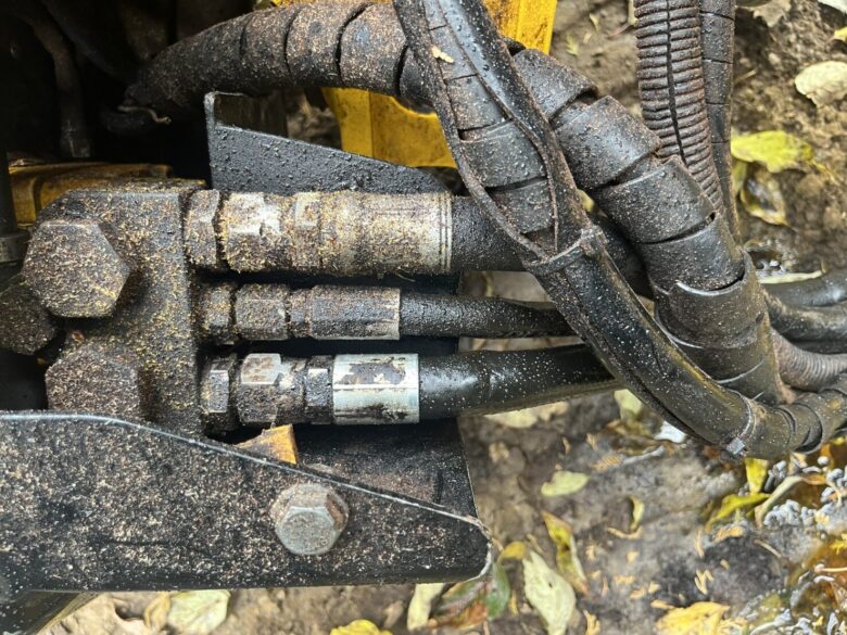 お客様より「ハーベスターのホースから油漏れしている」とのご連絡をいただき現場へ急行。林業機械のアタッチメント部は可動範囲が広く、切断・把時動作を繰り返すため、早急な対応が求められます。