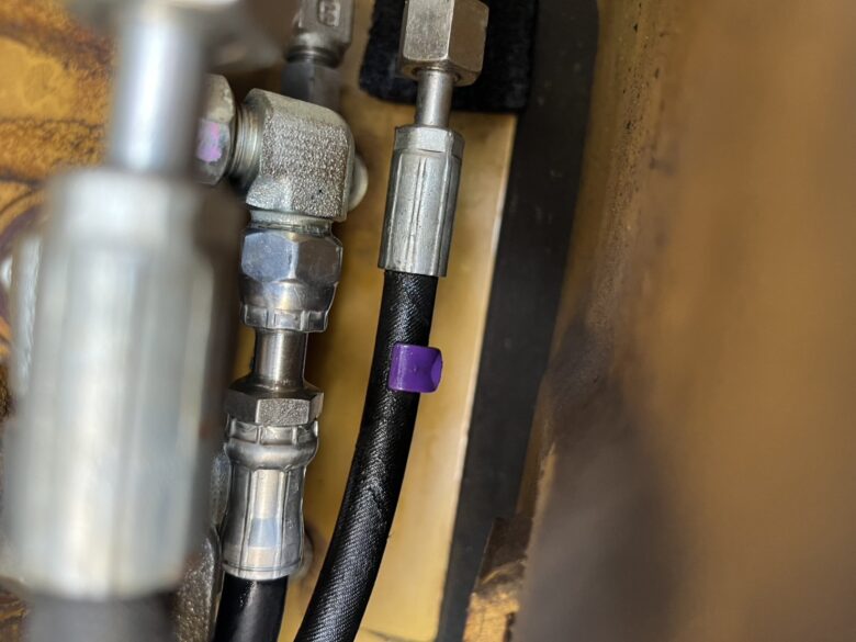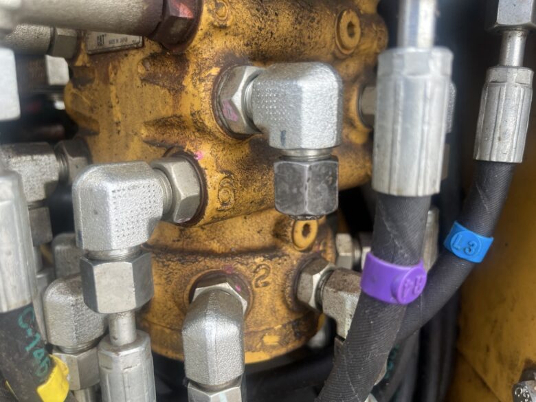 到着後、さっそく点検すると、お客様のいう通りコントロールバルブとマルチをつなぐパイロットホースから油が漏れていました。原因はホースの経年劣化と擦れ。放っておけばさらに大きなトラブルにつながる状況でした。