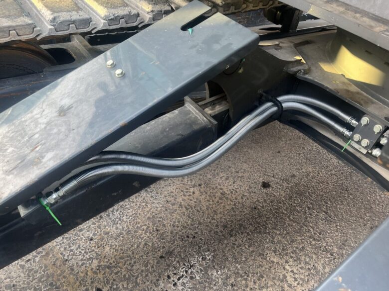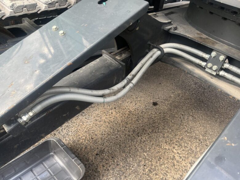 お客様より「排土板ホースに外傷があり、早めに交換してほしい」とのご連絡をいただき、現地へ出張対応。排土板のホースは、作業中に地面や障害物と接触しやすい位置にあるため、外的要因による損傷が発生しやすい部位です。劣化や外傷を放置すると、油漏れや作動不良の原因となるため早期交換が重要です。