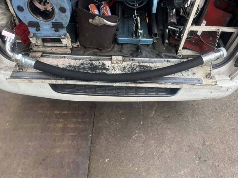 製作したホースをすぐに現場に持ち戻り、スピーディーに取り付け作業を実施。その後エンジンを始動して動作確認と油漏れチェックを行いましたが、問題無し!圧力テストもクリアし、アームの動きもスムーズに復旧しました。最後に清掃と最終確認を行い、無事に作業完了です。
