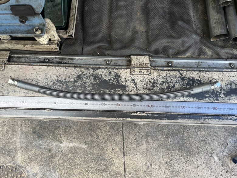 まずは機械を安全な状態に整えてから、タンク内の残圧をしっかりと抜きました。次に油受けをセットし、対象ホースを慎重に取り外します。その場で同じ仕様のホースを製作し、丁寧に取り付けを実施。接続部分のフィッティングは確実に締め込み、油漏れの心配がないように仕上げました。
