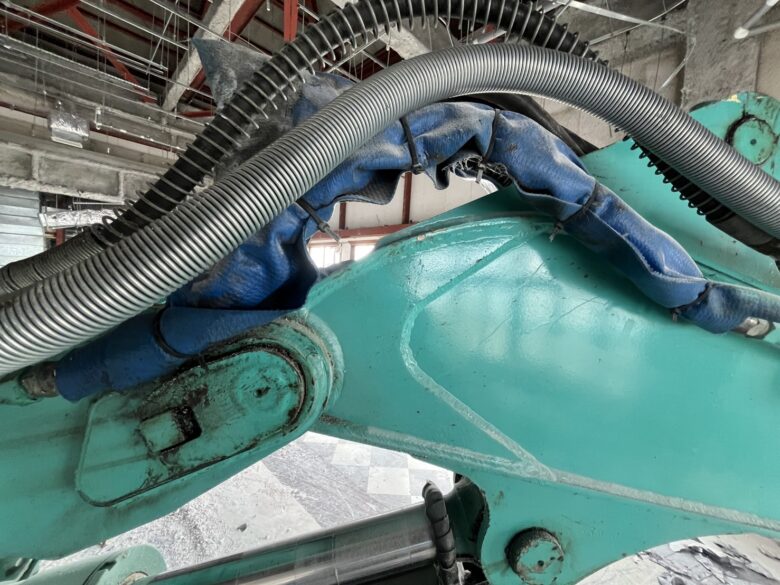 到着後に点検すると、アーム上にあるアタッチメントラインが劣化によりひび割れを起こし、作動油が漏れ出している状態でした。症状をお客様にご説明し、すぐに交換作業を開始します。