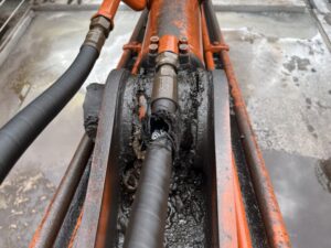 ブーム根元ホース交換作業 油圧ショベルにおいて、作動油ホースの劣化は機械の性能や安全性に直結する重要なポイントです。 今回は、PC138US-10のブーム根元からコントロールバルブへ接続されている油圧ホースの交換作業をご […]