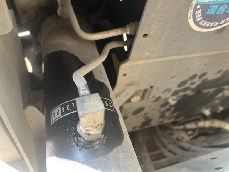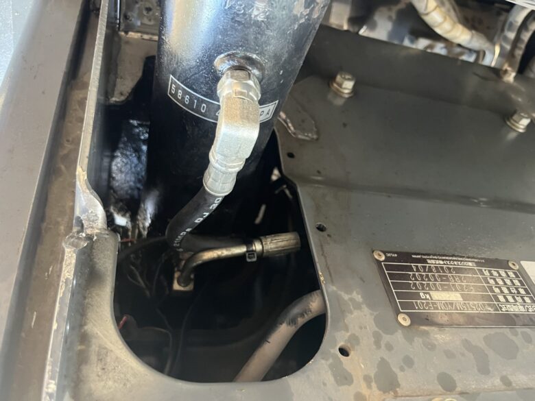 ご連絡内容は、「ホースの金具部分に物を落としてしまい、そこから油が漏れている」とのこと。現地へ急行し、フォークリフトの状態を確認したところ、チルドシリンダーに接続されている油圧ホースの金具が変形しており、シリンダーとの接合部から油漏れが発生していました。