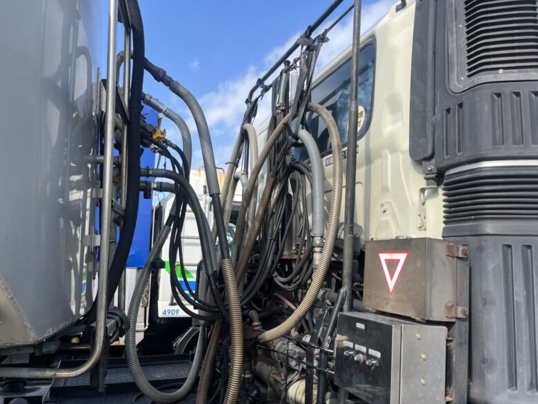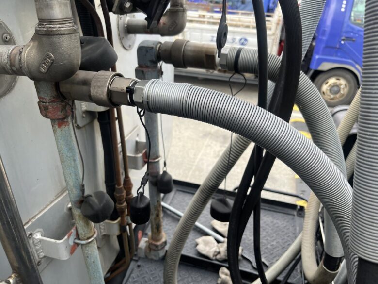 今回は、東海市にてトレーラーの渡りホース交換作業を行いました。「渡りホースから油漏れが発生している」とのご連絡をいただき安全確保のため早急に現地へ向かいました。渡りホースは走行時の振動や屈曲の影響を受けやすく、劣化が進むと油漏れにつながりやすい重要部位です。