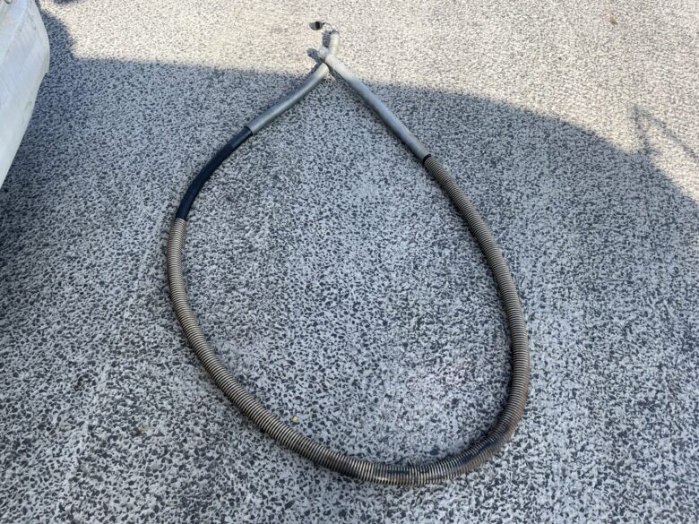 まずは周囲をしっかりと養生し。作業中に油が飛散しないよう準備を整えます。続いて、劣化した渡りホースを慎重に取り外しました。取り外したホースを基に、現地にて同仕様のホースを製作。車両の動きに追従できる様、長さや取り回しにも注意しながら取付を行いました。固定状態や干渉の有無をを確認し、確実に取り付けを完了させます。