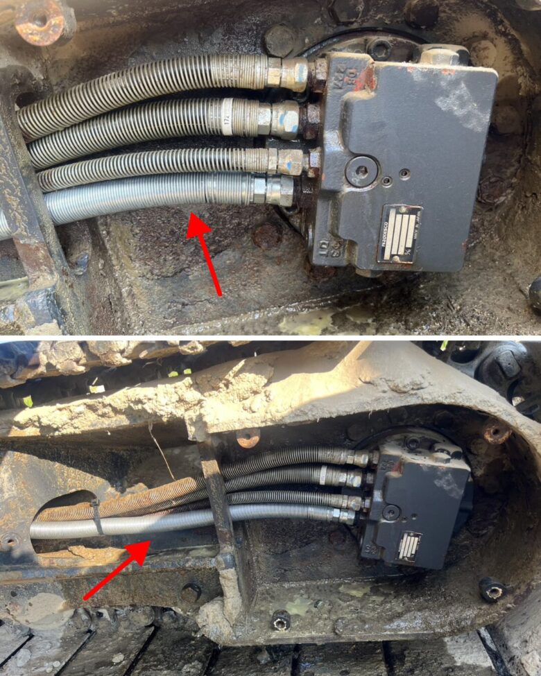 ご依頼内容は「走行モーター付近から油が漏れている」とのこと。現地で確認したところ、走行モーターに接続されている油圧ホースが劣化で敗れ、作動油が流れ出していました。このままでは走行不能になるだけでなく、周囲を汚染してしまう可能性もあるため、即対応が必要でした。