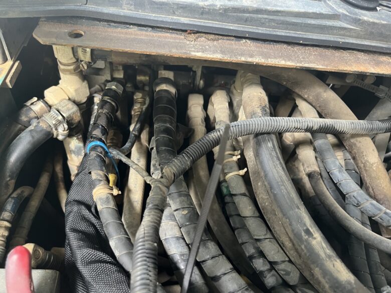 現場でバケットシリンダーのホースが破損し、油漏れが発生しているとのことで、すぐに現地へ急行。点検を行ったところ、他のホースにも劣化が見られたため、お客様のご判断で作業機に関わるホースをすべて交換することになりました。