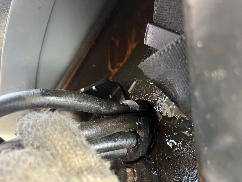 到着後に状況を確認すると、左レバーのパイロットホース旋回ラインから油漏れが発生していることが判明。放置すると作動油の減少による操作不良や、さらなる故障につながる恐れがあるため、早速交換作業に取り掛かりました。